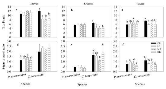 The effects of biochar fertilization on the plant N to P ratio and sugar to starch ratio of leaves (a), shoots (b), and roots (c) in Pinus massoniana and Cunninghamia lanceolata. Different lowercase letters above bars in the same species mean significant differences at p ≤ 0.05. CK: control, LB: low biochar addition, MB: medium biochar addition, HB: high biochar addition.