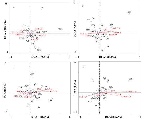 The first two ordination axes of the detrended correspondence analysis (DCA) could account for 75.9% (first axis) and 15.5% (second axis) of the stoichiometric relationships for control, 80.6% and 7.1% for low biochar addition, 84.0% and 6.5% for medium biochar addition, and 81.9% and 1.8% for high biochar addition (Figure 5a–d). Biochar fertilization enhanced the interactive effect of soil C:N, soil C:P and soil N:P on the plant nutrients and stoichiometry, especially the P concentration and the sugar to starch ratio in leaves, shoots, and roots (Figure 5b–d).