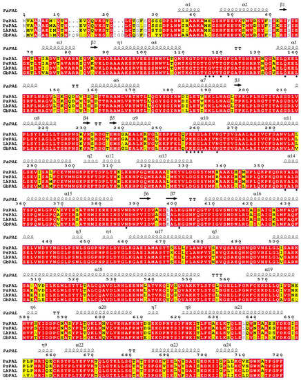 Multiple alignment of the deduced PaPAL protein with other plant phenylalanine ammonia-lyase (PAL) proteins. The sequences are from Picea sitchensis (PsPAL, ABK24709.1), Larix kaempferi (LkPAL, AHA44840.1) and Ginkgo biloba (GbPAL, ABU49842.1). Completely identical amino acid sequences are indicated with white words and red backgrounds. Highly conserved amino acid sequences are represented with black words and yellow backgrounds. Non-conserved amino acid sequences are shown with grey words and white backgrounds. α-Helices are displayed as large squiggles and η-helices as small squiggles. Strict β-turns are shown with TT letters and β-strands as arrows. Strictly conserved amino acid residues are shown as ★.