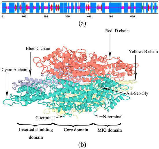 The secondary structure of the PaPAL protein was predicted by the SOPMA tool. The results indicated that PaPAL consists mainly of α-helices (57.64%) and random coils (29.44%) as well as a few extended strands (7.08%) and beta turns (5.83%) (Figure 3a). To better understand the structure and function of the PaPAL protein, the tertiary structure was predicted using SWISS-MODEL based on the crystal structure of Petroselinum crispum PAL (PDB: 1W27) [42]. The model covered the amino acids 31–720 of PaPAL, and its secondary structure is shown in Figure 2. In particular, the tertiary structure of PaPAL consists of four subunits that assume a seahorse shape (Figure 3b) [41]. In addition, each subunit is composed of an MIO domain, a core domain and an inserted shielding domain. The highly conserved Ala-Ser-Gly triad, which acts as an active site for cyclization and dehydration for MIO group formation, was also found within the MIO domain [5].