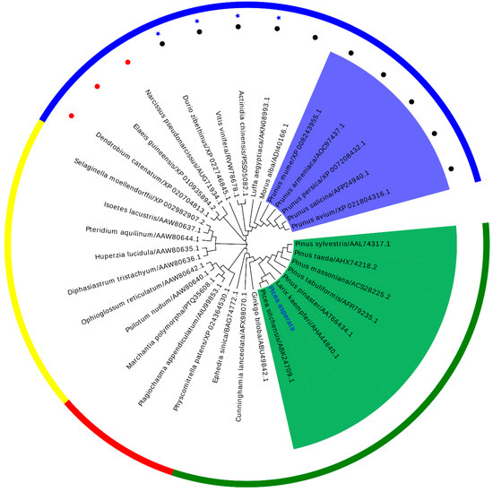 A phylogenetic tree between PaPAL and other plant PALs was constructed by the neighbor-joining (NJ) method. Outer circle: Gymnosperm species are shown in green, bryophyta species in red, pteridophyta species in yellow, angiosperm species in blue. The liana species are represented in ★. The monocot species and dicotyledon species are represented with ● and ●, respectively. Inner ring: Rosaceae species are indicated with a blue background and Pinaceae species with a green background.