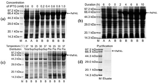 To confirm PaPAL protein expression in E. coli and determine its functional activities, a recombinant plasmid was constructed using the pET28a (+) vector. In addition, induction expression conditions were optimized to obtain the maximum amount of PaPAL protein. According to SDS-PAGE analysis, the molecular weight of recombinant PaPAL was approximately 82 kDa, which was consistent with the expected size of PaPAL (approximately 79 kDa) fused to a 3 kDa His-tag peptide (Figure 5a). Moreover, the recombinant PaPAL protein was not detected in the negative controls (including empty-vector pET28a(+) in E. coli BL21(DE3) with 0.6 mM IPTG added, empty-vector pET28a(+) in E. coli BL21(DE3) with no IPTG added and pET28a(+)-PaPAL in E. coli BL21(DE3) with no IPTG added). The highest expression level of recombinant PaPAL was detected by adding 0.2 mM IPTG (Figure 5a) followed by incubation for 4 h (Figure 5b). Furthermore, the distribution of recombinant PaPAL in the supernatant and precipitate was detected (Figure 5c). Most of recombinant PaPAL was found in inclusion bodies, and the proportion in the soluble fraction increased slightly with decreasing induction temperature. Therefore, recombinant PaPAL was produced with induction of 0.2 mM IPTG at 16 °C for 4 h. Recombinant PaPAL was purified by 6×His-tag affinity (Figure 5d), and the concentration of the purified protein was 0.83 mg/mL.