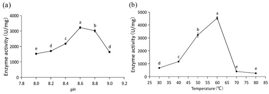 A high level of PAL activity was determined for the purified recombinant PaPAL protein. The optimal pH was 8.6, with activity for converting L-phenylalanine to trans-cinnamic acid of 3224.10 U/mg at this pH (Figure 6a). In addition, the optimal temperature of recombinant PaPAL activity was determined to be 60 °C, and its catalytic activity was 4536.14 U/mg at this temperature (Figure 6b).