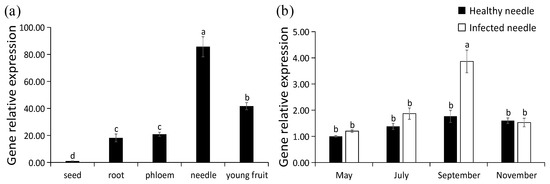 The expression levels of PaPAL in P. asperata were analyzed by qRT-PCR. PaPAL transcripts were detected in all of the tissues examined (Figure 7a). The lowest expression level was found in the seed, which was normalized to 1. The highest expression level was determined in needles, followed young fruit. The expression levels of PaPAL in the root and phloem were similar.