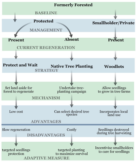 If forest is the desired land cover, the next step is to identify the site conditions associated with native forest regeneration (Figure 1). The presence of native tree seedlings is a good indicator of the ability of the forest to regenerate and depends on the site’s ecological and management conditions [16]. Ecological conditions known to predict the presence and abundance of native tree seedlings include past forest cover, distance from current native forests, fire frequency, and the presence of competing vegetation. Sites previously forested may regenerate due to the presence of dormant seeds in the soil [17]. The distance from current forest edges also predicts native seedlings presence and abundance, partly by providing a proximate source of dispersers and seeds [18,19]. Conversely, fast-growing vegetation, such as grasses and shrubs, can out-compete native tree seedlings [20]. Other factors, like the presence of remnant trees, appear to increase native seedlings’ success either by self-propagation or by providing roosting spots for dispersers [21].