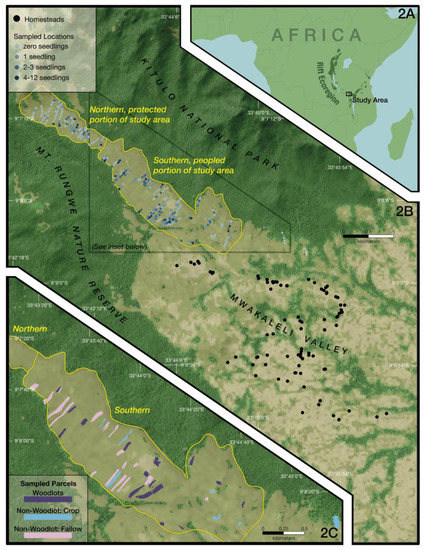 - Chapman, C.A.; Chapman, L.J.; Kaufman, L.; Zanne, A.E. Potential causes of arrested succession in Kibale National Park: Growth and mortality of seedlings. Afr. J. Ecol. 1999, 37, 81–92. [Google Scholar] [CrossRef]