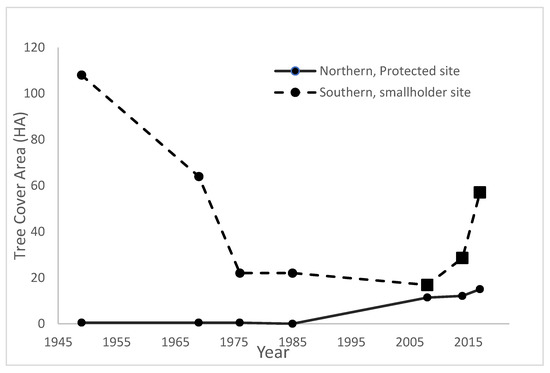 Imagery interpretation showed that tree cover increase has been low in the northern, protected portion of the site, while in the smallholder portion, tree cover initially decreased, and then started to increase (Figure 3). The northern portion has been free from any farming since at least 1949, according to aerial photography evidence and local respondents. However, a modest wooded area covering ~15 Ha (16%) has appeared in the intervening six decades (Figure 3). Meanwhile, in the southern portion, 108 Ha were converted from native tree cover to farmland between 1949 and 1975 (Figure A1). Since 1975, the native forest edges have remained steady in the southern portion, but woodlots have increased non-native tree cover since 2008 (Figure 3).