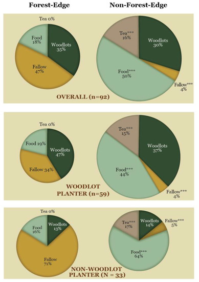 Land-use apportioning by respondents. All charts on the left show forest-edge land use; on the right, non-forest edge land use. Chart size is proportional to average land area. Statistical significance determined by paired t-test (edge versus non-edge) for each land-use type, with the respondent as a response variable. *** p < 0.001.