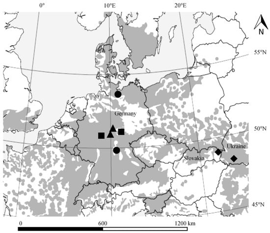 Geographic locations of the eight study sites with their management regimes (▲ = traditionally managed, ● = alternatively managed, ■ = National Parks, ♦ = primary forests; modified after Stiers et al. []) in relation to the potential natural vegetation (grey) of European beech without human influence according to the European Forest Genetic Resources Programme (EUFORGEN) [].