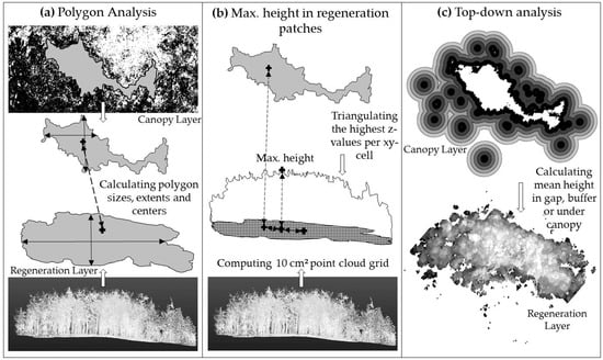 Illustration of the three different approaches used in this study. (a) Data analysis to calculate polygon sizes, maximum extents and center positions based on manually delineated polygons. (b) Computing 10 cm point cloud grids to identify the maximum height within the regeneration patches. (c) Top-down analysis based on raster data of 10 cm2 resolution to analyze the top-down dependency.