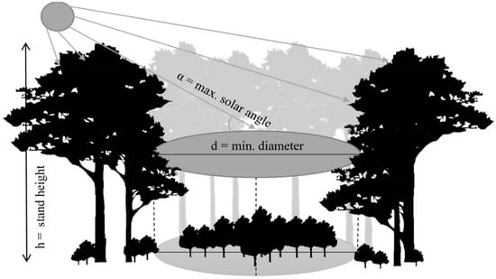 Schematic representation of the relationship between stand height (h) and maximum solar angle (α) and the resulting minimum diameter (d) of the canopy gap to allow incidence of direct sunlight.