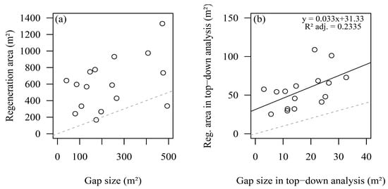 Scatterplots of regeneration area (m2) over gap size (m2). (a) Non-significant relationship between gap size and resulting regeneration area based on polygon analysis. (b) Significant relationship between gap size and regeneration area based on raster data in top-down analyses. The dashed grey lines mark the 1:1 relationship between both sizes.