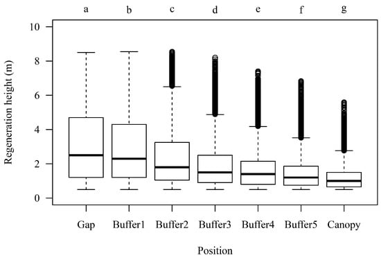 Box–whisker plots of the regeneration vegetation height (m) in dependence of position in gap, in buffer zone (1–5 m) or under closed canopy. Different lower-case letters indicate significant differences between positions at the level of p < 0.05.
