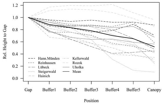 The different lines illustrate the mean height development of the regeneration relative to height in gap measured for seven classes; Gap = heights within the gap polygon; Buffer 1–5 = subsequent 1 m buffer zones around the gap polygon; Canopy = all remaining heights under the canopy. Each line represents one of the 16 study plots; the solid black line shows the mean height decrease of all plots together.