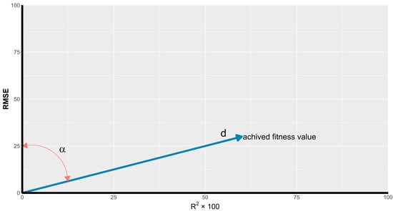 Feature selection is an essential task in working with hyper-dimensional data, in which the best subset from all features is selected based on lower cost of model training and higher accuracy. This solution is essential in the presence of a large number of extracted features and small sample size to avoid the prohibitive effects of the curse of dimensionality on model performance and interpretability []. Therefore, a proper method for feature selection cares for the low training cost while avoiding the curse of dimensionality in the modeling []. The genetic algorithm (GA) is an evolutionary method for optimization. The method is inspired by natural selection in the real world, with the main idea of incorporating a wide range of suitable solutions that leads to selection of an optimum solution []. We used binary GA for feature selection. First, a population of chromosomes with 0 and 1 genes was randomly generated in which each chromosome is considered as a solution. The goodness of each solution was determined by the fitness function. The solutions with higher goodness had a higher chance to create a new solution. The new solution was then created by crossover procedure from two randomly selected solution with a high fitness value. The mutation operator changed the random genes with little probability and was used to maintain genetic diversity from one generation of a population of genetic algorithm chromosomes to the next. Finally, the algorithm was iterated until the fitness value remained unchanged []. Here, we selected the features for each kernel individually by cross-validation (see Section 2.4.3). The fitness function pursued the goal to simultaneously RMSE and R2 values (see Figure 2). For this purpose, the fitness function as defined in Equations (7)–(9) was proposed. In this fitness function, the highest fitness value could potentially occur in R2 equal to 1 and RMSE equal to 0, i.e., a fitness value equal to 190.