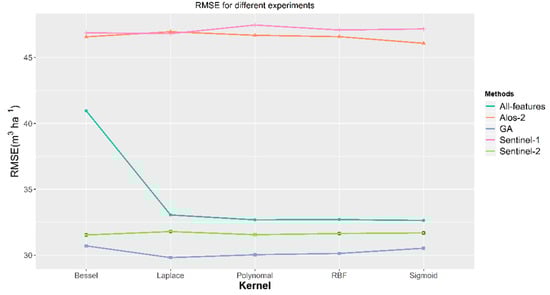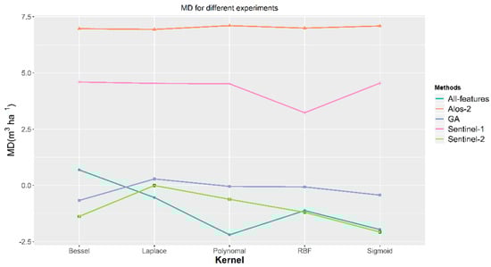 As can be seen in Table 8, the Laplace kernel exceeded all other applied kernels with RMSE = 46.815 and R2 = 0.299 again, closely followed by the Bessel kernel with RMSE = 46.879 and R2 = 0.297. Moreover, the Bessel kernel provided more stable results than other kernels (RMSE_SD = 6.302 and R2_SD = 0.113). The MD index shows that all of models significantly over estimate the GSV after ALOS2. By considering both performance and stability, the Bessel kernel was slightly better compared to the other kernels.
