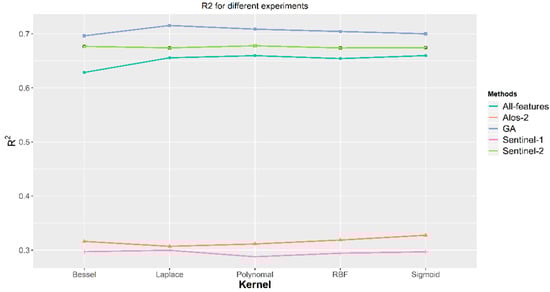 Here, the 31 features extracted from the Sentinel-2 data were used for the GSV modeling (see Table 2). As previously mentioned in Section 2.3, the SVR model was employed using five different Kernels. The kernel’s hyper-parameters were tuned with repeated cross-validation. The results can be seen in Table 6.