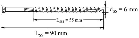 Japanese cedar (Cryptomeria japonica (L. f.) D. Don) lumber was harvested in Hsinchu, Taiwan, the tree age measured approximately 35 years old, and processed by Jang Chang Lumber Industry Ltd., Taiwan. Before processing, the lumber was oven-dried and conditioned to approximately 15% moisture content, and the overall average density of the lumber was 452 ± 53 kg/m3. Processed lumber dimensions for the flanges were 38 × 140 × 3300 mm3 and those for the web were 38 × 89 × 3300 mm3. Furthermore, the lumbers were stress-graded based on Chinese National Standard (CNS)-14630. The nominal grade of E50 implies 4 GPa ≤ flexural modulus of elasticity < 6 GPa; E70 implies 6 GPa ≤ flexural modulus of elasticity < 8 GPa; E90 implies 8 GPa ≤ flexural modulus of elasticity < 10 GPa; and E110 implies 10 GPa ≤ flexural modulus of elasticity < 12 GPa. Moreover, self-tapping screws were selected and purchased from Rothoblaas®, Cortaccia, BZ, Italy; their specifications are shown in Figure 1.