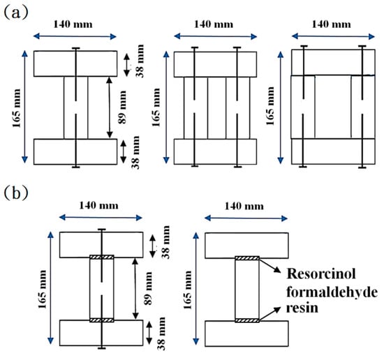 To study the effects of factors such as cross sections and component grades on the flexural capacity, the Cryptomeria japonica built-up beams were assembled using lumbers of different grades, and the cross sections are illustrated in Figure 2a. Moreover, to enhance the bonding between flanges and the web, as well as for comparison with the conventional glue-bonding method, two types of built-up beams were produced as shown in Figure 2b.