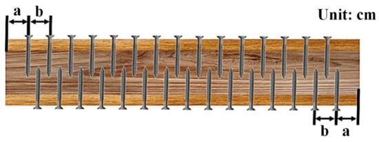 In contrast to adhesives, metal connectors such as nails and screws used for assembling built-up beams can be highly efficient and time-saving because the curing time for adhesives is not required. Because metal connectors are mainly responsible for connecting the wood members of the built-up beam, the specifications of the metal connectors and their connection capacity with wood should be carefully considered. Studies have revealed that the diameters of connectors exhibit a linear relationship with withdrawal resistance [,,,] and that the screw-withdrawal resistance is usually higher than the nail-withdrawal resistance []. Furthermore, previous research has indicated that adding glue when using metal connectors to assemble built-up beams can improve their flexural mechanical performance []. In particular, resorcinol formaldehyde resin can result in high bonding strength and increase the shear resistance capacity [,].