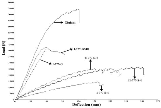 Figure 7 presents the common failure modes of the developed built-up beams. The failures usually resulted from the locations of the self-tapping screws and natural defects such as knots. Moreover, the failure locations were sometimes observed at the web, particularly at the position of the screws, indicating wood crushing failures caused by side compression from the self-tapping screws. Cracks then propagated along the wood grain, eventually resulting in web failure. Johnson et al. [] also mentioned the failures would begin near the position of metal fasteners in flanges of wood I-beams. Occasionally, surface compression failure was observed at the loading positions on the top flanges. For the glued built-up beams and the glulam beams, the failure locations were usually observed at the natural defects of lumber due to stress concentration, which initiated from wood and propagated along the wood grain. Furthermore, tension failures at the bottom flange were typical cases for glued built-up beams and glulam. On the other hand, web buckling used to be of major concern for wood I-beams []; however, in this study, thick lumber webs were used so that no typical web buckling was observed.