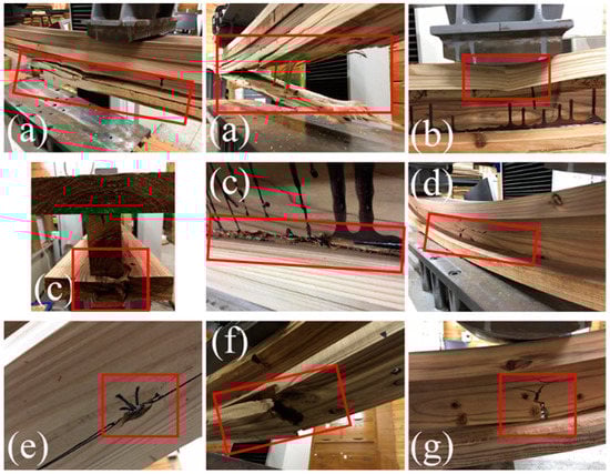 Failure modes of the developed built-up and glulam beams: (a) tensile failure at bottom of glulam, (b) compression failure at top flange, (c) failure at wood on glued surface, (d) horizontal shear failure at the web, (e) crushing on the surface using self-tapping screws, (f) failure at knot, and (g) crack at the self-tapping screw joint location.