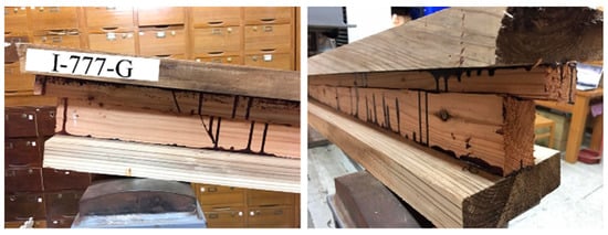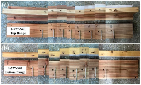 Horizontal shear failure in the web at the edge of the beams can be found in the built-up I-beams, as shown in Figure 8. In addition, slippage between the flanges and the web can be commonly observed in the screwed built-up beams (Figure 9); furthermore, a longer spacing between the self-tapping screws resulted in more noticeable slippage between the flanges and the web. The slippage between the flange and web may resulted from incomplete interaction between the flange and web and should be carefully considered in design []. However, adding glue improved the slippage resistance capacity by enhancing the bonding between the flanges and web. Some previous studies also concluded that metal fastener-glued built-up beams showed greater mechanical performance than those using either metal fasteners or glue [,]. In particular, when the screw position was close to the beam edge, deep penetration into the flange due to surface crushing by the screws was observed. Owing to horizontal shear force, self-tapping screws may be withdrawn; however, because self-tapping screws exhibit a high grip on wood, surface crushing on flanges can be observed.