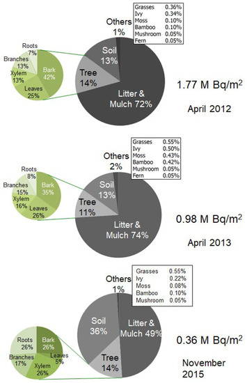 In April 2012, one year after the accident, a very low level of radioiodine (2 to 5 Bq as mostly 131I) was detected, but high levels of 134Cs and 137Cs were detected at levels similar to those in the forest, as shown in Figure 1 (area number 2). The total radiocesium in this forest was 1.77 MBq/m2, and the distribution was as follows: litter and mulch (72%), trees (14%), and soil (13%). The trees contained radionuclides in the bark (42%), leaves (25%), xylem (13%), branches (13%), and roots (7%), as shown in Figure 3. Some of the radionuclides in the litter replaced those in the leaves because some of the leaves exposed in 2011 were recovered from the litter and mulch fraction. Because most of the radiocesium in trees was present in the bark, the trees’ major source of irradiation might have been direct exposure.