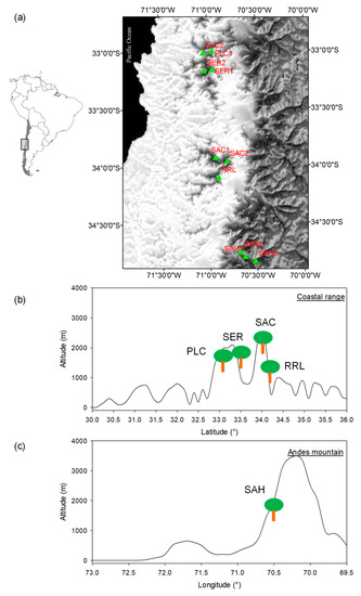 The study area is located in central Chile (from 32°57′ to 34°51′ S, and from 71°07′ to 70°40′ W) (Figure 1), with typical Mediterranean climate characterized by precipitation concentrated in winter (June to July) and a long, dry summer (December to March). The climate in the coastal range is drier than in the Andes range [35]. The inter-annual rainfall in this region is highly variable and very influenced by ENSO episodes, with warm (cold) events in central equatorial Pacific associated with wet (dry) conditions in Central Chile [36]. Along the Andes range, soils are developed from volcanic or granitic rocks and from glacial sediments, and are classified in the large group of forest brown soils, with a medium depth on slopes and greater depth in the high plains [37]. Along the Coastal range, soils are formed from granitic rocks in the Cordillera heights at the northern coast of the study region and are poorly developed, which are usually residual on rocky outcrops [20].