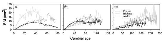 Long-term growth trends of BAI, according to cambial age, showed a sustained growth for all populations and three age classes (Figure 2). Therefore, it seems that all populations show a growth decline in recent decades. However, there was a noticeable increase in the first 50 years of life in younger trees of the highest population, which was better growth performance than any other trees (Figure 2a). Mature trees from Coastal populations and the highest populations showed a growth increase since ~100 years of cambial age, while, in Andes populations, showed a decline in growth for ~80 cambial years (Figure 2b). After 50 years, younger trees begin a decline in growth in the Coastal populations and the highest populations, while older trees from Andes showed a decline in growth from 150 years of cambial age in the tree populations (Figure 2c).