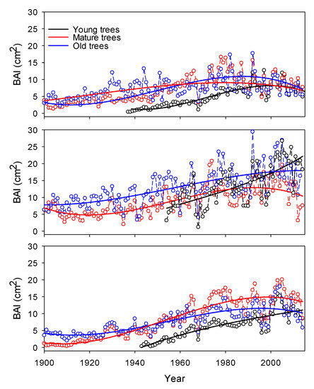 where rt and rt−1 corresponds to tree radius at DBH calculated at the end and beginning of the annual increment in years t, respectively [45]. BAI is recommended to represent individual and stand-level changes [34,45,46]. Annual BAI for each tree were estimated from raw ring-width series using R (version 1.7.0) package dplR [47].