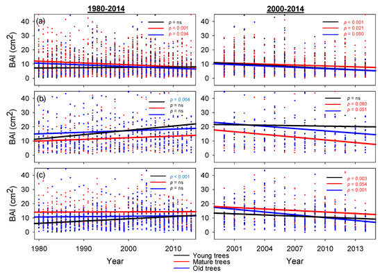 Growth trends of the basal area increment (BAI) of N. macrocarpa, according to the cluster population and age classes for the period from 1980 to 2014 and 2000 to 2014. Values of ‘p’ in blue indicate positive significant linear trends (at a significant level of 90%), and, in red, the negative linear trends. (a) Coastal, (b) Highest, and (c) Andes.