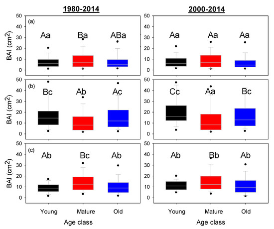 Difference of the basal area increment (BAI) of N. macrocarpa populations among clusters and age classes for the period of 1980 to 2014 and 2000 to 2014. Uppercase letters indicate a difference among age classes by cluster. Lowercase letters indicate a difference among population clusters by age classes (Kruskal-Wallis test using p < 0.05). (a) Coastal, (b) Highest, and (c) Andes.