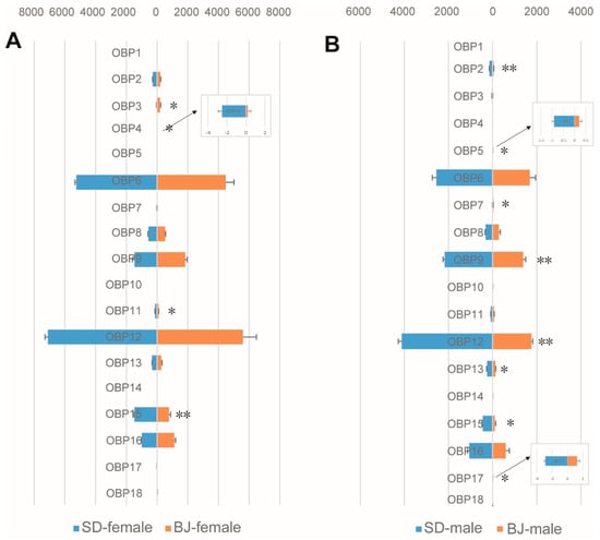 Comparison of odorant binding protein (OBP) genes expression levels in both sexes of the two S. bifasciatus populations. The horizontal axis refers to the expression level of the genes (FPKM values, mean ± SE, n = 3). (A): OBPs expression level comparison between females of the two population; (B): OBPs expression level comparison between males of the two population. BJ, Beijing population; SD, Shandong population. * means the difference is significant at the 0.05 level; ** means the difference is significant at the 0.01 level.