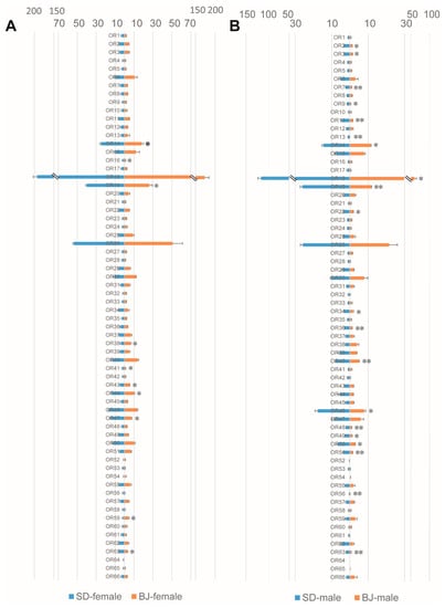 Comparison of odorant receptor (OR) genes expression levels in both sexes of the two S. bifasciatus populations. The horizontal axis refers to the expression level of the genes (FPKM values, mean ± SE, n = 3). (A): ORs expression level comparison between females of the two population; (B): ORs expression level comparison between males of the two population. BJ, Beijing population; SD, Shandong population. * means the difference is significant at the 0.05 level; ** means the difference is significant at the 0.01 level.