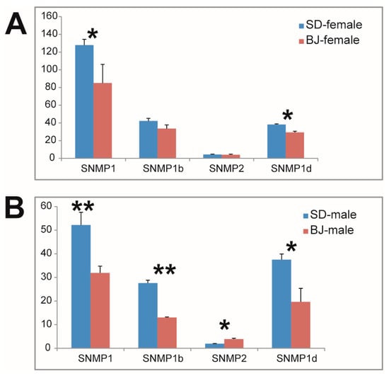 Comparison of sensory neuron membrane protein (SNMP) genes expression levels in both sexes of the two S. bifasciatus populations. The vertical axis refers to the expression level of the genes (FPKM values, mean ± SE, n = 3). (A): SNMPs expression level comparison between females of the two population; (B): SNMOs expression level comparison between males of the two population. BJ, Beijing population; SD, Shandong population. * means the difference is significant at the 0.05 level; ** means the difference is significant at the 0.01 level.