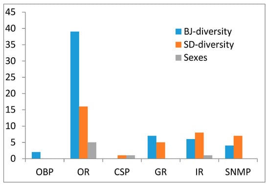 We collected the conserved SNP sites of the chemosensory genes of both sexes in the two S. bifasciatus populations, where 2 SNPs in OBPs, 2 SNPs in CSPs, 63 SNPs in ORs, 12 SNPs in GR, 16 SNPs in IRs, and 11 SNPs in SNMPs were obtained (Supplementary Table S2). Then we analyzed the SNP sites of each gene. If the acid bases at the SNP site were the same in the three repeats of Shandong population but different in that of the Beijing population, we record this SNP site as Beijing diversity SNP site; reversely, if the acid bases at the SNP site were the same in the three repeats of the Beijing population but different in that of the Shandong population, it was recorded as Shandong diversity SNP site. Similar rules were used in the SNP site recording related to sexes. Figure 4 illustrates the total SNP site numbers that we found as Beijing diversity, Shandong diversity, and diversity between sexes in each chemosensory gene type. Interestingly, most of the SNPs in OBPs and ORs were Beijing diversity ones, while fewer showed diversity in the Shandong population and only several SNPs were correlated to the sexes of S. bifasciatus; however, the Beijing diversity and Shandong diversity SNPs number were similar in CSPs, GRs, IRs, and SNMPs.