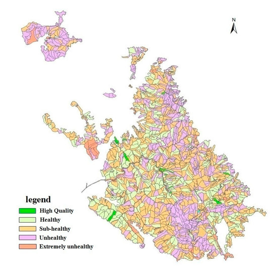 According to the statistical analysis function of GIS, the total area of high quality sub-compartments was 80.42 ha, accounting for 0.69% of the total forest area; the total area of healthy sub-compartments was 2671.04 ha, accounting for 22.77%; the total area of sub-healthy sub-compartments was 7115.63 ha, accounting for 60.65%; the total area of unhealthy sub-compartments was 1767.63 ha, accounting for 15.06%; the total area of extremely unhealthy sub-compartments was 98.24 ha, accounting for 0.84%. The area and percentage of the forest in different health levels are shown in Table 8.