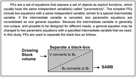 For the purpose of converting forest volume to SABB, a volume-SABB equation can be used with an independent volume variable (Bt = αVβ, Bt is SABB including foliage, branch, stem, and root biomass, t ha−1; V is stem volume, m3 ha−1; α and β are parameters). This relationship between volume and biomass has been proposed in various forms by previous studies [16,18,20]. Although the studies addressed AGB, their approaches are also valuable for estimating SABB. An inspirational approach is the use of BCEF and multiplying both sides by growing stock volume [16]. The biomass equation, in form, expresses two parts of biomass, which might be considered to represent stem and non-stem organs respectively. This can predict the biomass that maintains biological soundness [16]. Statistically, using the above equations, a number of field measurements are required for model calibration. If the measured data are relatively few, it may be difficult to parameterize. For example, due to the cost of measuring BGB, there are only several samples for SABB. The parameters α and β may not be easily determined for the equation Bt = αVβ. In the graphical analysis of the model, the physiological relationship between V and Bt can neither be obviously observed nor simply tested. Thus, whether or not to create a direct causal relationship of V and Bt becomes an issue of interest. Generally, this issue can be abstracted as a black-box problem, which should be solved gradually in stages to reduce uncertainty of model predictions (Figure 1). The uncertainty can be identified according to the general technical flow of nonlinear system identification, namely, data preparation, model postulation, parameter identification, and model validation [46]. Such a procedure makes it clear that the conventional volume-SABB equation needs to be converted to a set of PEs. These postulated equations and related algorithms are explained in the following sections in detail.