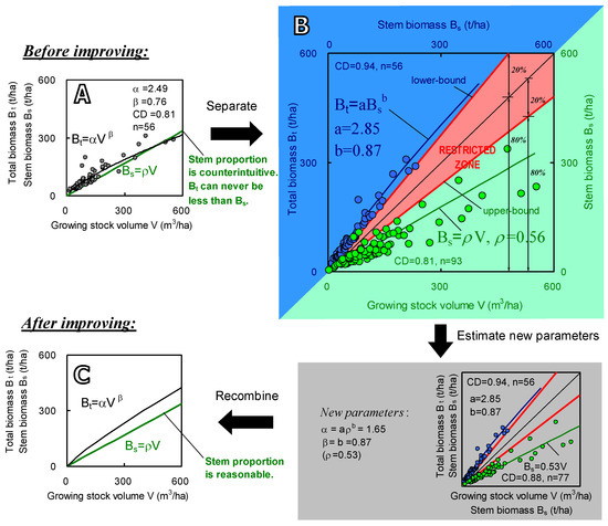To follow the above strategy and formulation, two points should be noted: (i) improving parameters by utilizing PEs is a “separate-to-recombine” process (see Figure 2). After the improvement, the power β in Equation (3) is same as the power b in Equation (1). This is because the curvature of Equation (3) is only affected by the allometric relationship of Bs and Bt, but not by volume (V). If directly regressing field data for the variables Bt and V in Equation (3), the power β will usually be impacted more or less by possible outliers of the volume (V). Outliers make wood density estimates (ρ) largely inconsistent, which changes the curvature (β) of Equation (3). In short, the α and β will change after carrying out separate-to-recombine processing that forces ρ to be unique for a specified species. (ii) Through the separate-to-recombine procedure, the impacts of uncertainty or mistake in volume measurement can be excluded from parameter β. This allows us to concentrate on improving the parameter α by examining ρ. The necessity of the improvement is also illustrated in Figure 2A, in which the direct regression curve goes so far as to cross the line of Bs = ρV at the end. It clearly proves a counterintuitive relationship that may appear by performing regression analysis directly: stem biomass is greater than SABB. Summarily, we first separate the equation into two PEs (Figure 2A). Secondly, carry out regressions respectively for the two equations (Figure 2B). Then combine the two equations back into one standard volume-SABB equation as was the original form (Figure 2C). During this procedure, it should be emphasized that the restricted zone may be variable depending on different species.