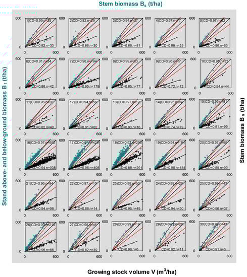 The correlation scatters of 30 tree species and forest types across the world. The least squares regression was performed for fitting V-to-Bs equation. The nonlinear regressions were conducted for fitting relationships of Bt and Bs. The scatters show stem biomass vs. SABB (curves with cyan crosses in top left sections) and growing stock volume vs. biomass (straight-lines with black crosses in bottom right sections). The top left parts illustrate the regression for Equation (1), and bottom right parts do this for Equation (2). CD means coefficient of determination; n is the numbers of plots. Every scatter has two red lines that warn the lower limit for Equation (1) and the upper limit for Equation (2). Note that these red lines are set up tentatively for approximate estimates of the restricted zone that may change for different species and types. The number of each scatter corresponds to the number listed in Table 1. Three variables (volume, stem, and SABB) were measured for most plots. The samples of Bs vs. Bt are less than the ones of V vs. Bs, because some plots were not measured for roots or volumes. For the data details refer to the footnotes of Table 1.
