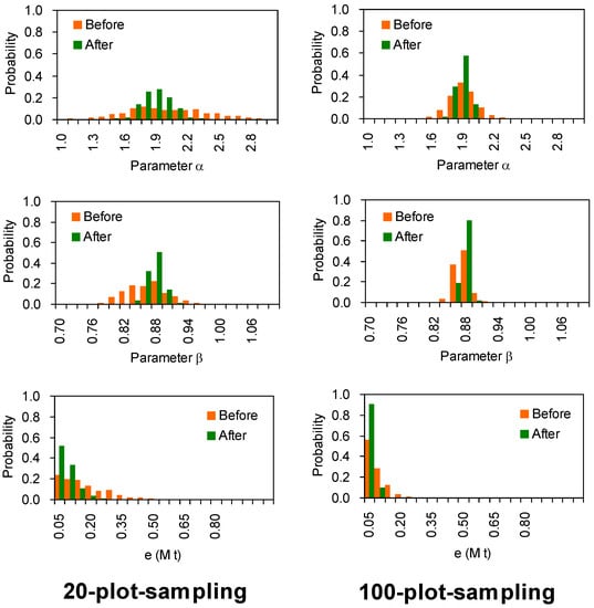 In addition, Figure 5 illustrates a comparison between distributions of the parameter (α and β) and residual (e), which denotes the difference between two estimations before and after improving the parameters based simulated data. The distributions of α, β, and e resulted from 500 simulations of setting stands. It is visible that improved α, β, and e generally have low standard deviations for both sampling designs (20-plot- and 100-plot-sampling). The convergence rates are faster on 100-plot-sampling than 20-plot-sampling for all tests of α, β, and e (Figure 5). This implies that the estimates are closer to the true value (5.18 Mt) by employing the 100-plot-sampling design than the 20-plot-sampling design.