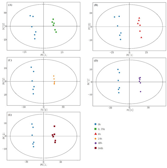 Principal component analysis (PCA) score plots of metabolic profiles during different seed germination times. (A–E) PCA score plots of seed germination at 0 and 0.75 h (A), 0 and 6 h (B), 0 and 24 h (C), 0 and 48 h (D), and 0 and 144 h (E).