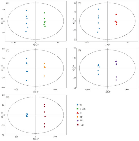 Orthogonal partial least squares-discriminate analysis (OPLS-DA) score plots of metabolic profiles during different seed germination times. (A–E) OPLS-DA score plots of seed germination at 0 and 0.75 h (A), 0 and 6 h (B), 0 and 24 h (C), 0 and 48 h (D), and 0 and 144 h (E).