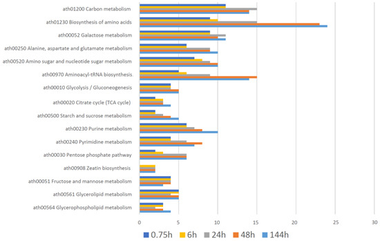 Significant differences in metabolites between time periods were assessed using Student’s t-test (p < 0.05) and the first principal component of the OPLS-DA model of VIP > 1. The pathways associated with differential metabolites, which were identified using the Kyoto Encyclopedia of Genes and Genomes (KEGG) Pathway database (www.kegg.jp/kegg/pathway.html), are shown in Supplementary Table S2. Most of these pathways were related to primary metabolites. In most pathways, the number of differential metabolites was not consistent over time (Figure 3). For example, the number of metabolites associated with starch and sucrose metabolism, the citrate cycle (TCA cycle), and glycolysis/gluconeogenesis slowly increased as seed germination progressed, whereas the number related to the pentose phosphate pathway increased until 24 h and then remained unchanged. The number of lipid-related metabolites, such as those involved in glycerolipid metabolism and glycerophospholipid metabolism, fluctuated and exhibited a decrease at approximately 24 h. Nucleic acid-related metabolites increased as germination progressed, while the number of metabolites associated with pyrimidine metabolism decreased after 48 h. The number of metabolites associated with amino acid pathways, which was significantly higher than that of other pathways, slowly increased over the course of seed germination; central amino acid metabolism-related compounds followed a similar trend. Metabolites related to zeatin biosynthesis were not detected until 6 h and then remained constant.