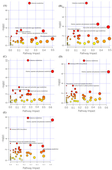 Pathway enrichment of differential metabolites. Pathway impact, which is an influence factor calculated from pathway topological analysis, is plotted on the abscissa, and −log (p), the negative logarithm of the p-value from pathway enrichment analysis, is plotted on the ordinate. Circle size is proportional to the degree of influence calculated from the topological analysis: The larger the circle, the larger the impact factor. The color of a circle reflects the negative logarithm of the p-value obtained from the enrichment analysis: The darker the color, the larger the absolute value of −log (p) and the more significant the enrichment. (A–E) Pathway enrichment during seed germination at 0.75 h (A), 6 h (B), 24 h (C), 48 h (D), and 144 h (E) vs. 0 h.
