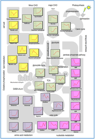 - Allen, E.; Moing, A.; Ebbels, T.M.; Maucourt, M.; Tomos, A.D.; Rolin, D.; Hooks, M.A. Correlation Network Analysis reveals a sequential reorganization of metabolic and transcriptional states during germination and gene-metabolite relationships in developing seedlings of Arabidopsis. BMC Syst. Biol. 2010, 4, 62. [Google Scholar] [CrossRef] [PubMed]