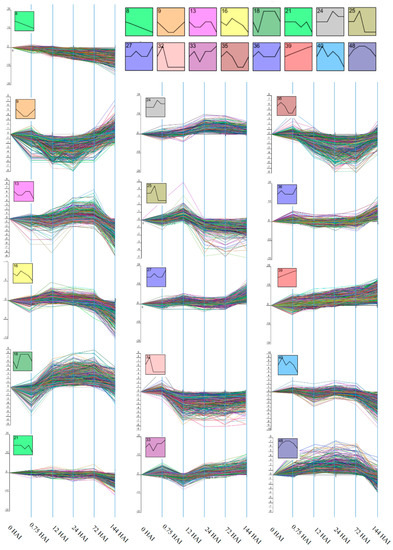 To reveal the variation among the DEGs, a STEM tool was used to cluster and visualize RNA-Seq expression profiles of 33,338 genes differentially expressed during seed germination at any given time point in the study (Table S1). STEM generates a series of potential profiles with respect to the direction and magnitude of expression, after which the enrichment of clusters is determined by comparing the distributions of observed groups with those expected in a random permutation [19,22,23]. Based on the expression patterns, profiles were classified into 50 categories. Figure 1 shows the gene expression profiles for the 16 clusters (clusters 8, 9, 13, 16, 18, 21, 24, 25, 27, 32, 33, 35, 36, 39, 40, and 48) found to be significant (p-value ≤ 0.05) out of 50 possible clusters. Approximately 8.6% of the total number of genes clustered belonged to cluster 8, ~4.4% to cluster 9, ~4.2% to cluster 13, ~7.5% to cluster 16, ~3.3% to cluster 18, ~3.2% to cluster 21, ~2.6% to cluster 24, ~1.8% to cluster 25, ~4.2% to cluster 27, ~2.6% to cluster 32, ~2.6% to cluster 33, ~3.8% to cluster 35, ~4.8% to cluster 36, ~12.9% to cluster 39, ~2% to cluster 40, and ~3.4% to cluster 48.