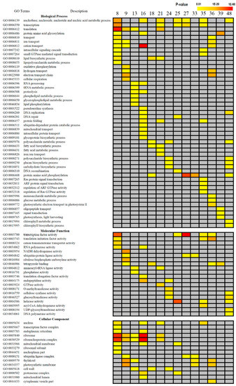GO analysis of the differentially expressed genes in each cluster. Using p-value < 0.05 as the criterion, the overrepresented GO terms (biological process; cellular component; molecular function), in each cluster were selected using the agriGO analysis tool. The color depth is proportional to enrichment.