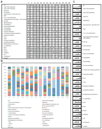 To understand the significance of these distinct patterns in transcript abundance changes, three types of analyses were conducted, with each providing a different insight into the molecular basis of the germination process in poplar. The first analysis was performed using MapMan tools to determine which functional categories were found in different significant clusters. The MapMan analysis revealed that a variety of functional categories were affected during the germination process and many of them belonged to different clusters. For example, there were 10 genes encoding major carbohydrate (CHO) metabolism categories in cluster 13, and 6 in cluster 16. There were 42 genes encoding amino acid metabolism categories in cluster 39, which was more than the number of genes in the other clusters. In addition, many genes from the same pathway were distributed among multiple clusters, such as genes encoding mitochondrial electron transport appeared in clusters 8, 9, 13, 16, 21, 33, 36, 39, and 48, and similar situations were presented for other pathways. This analysis showed that gene regulation, in the same functional category, has different regulatory modes (Figure 3a).